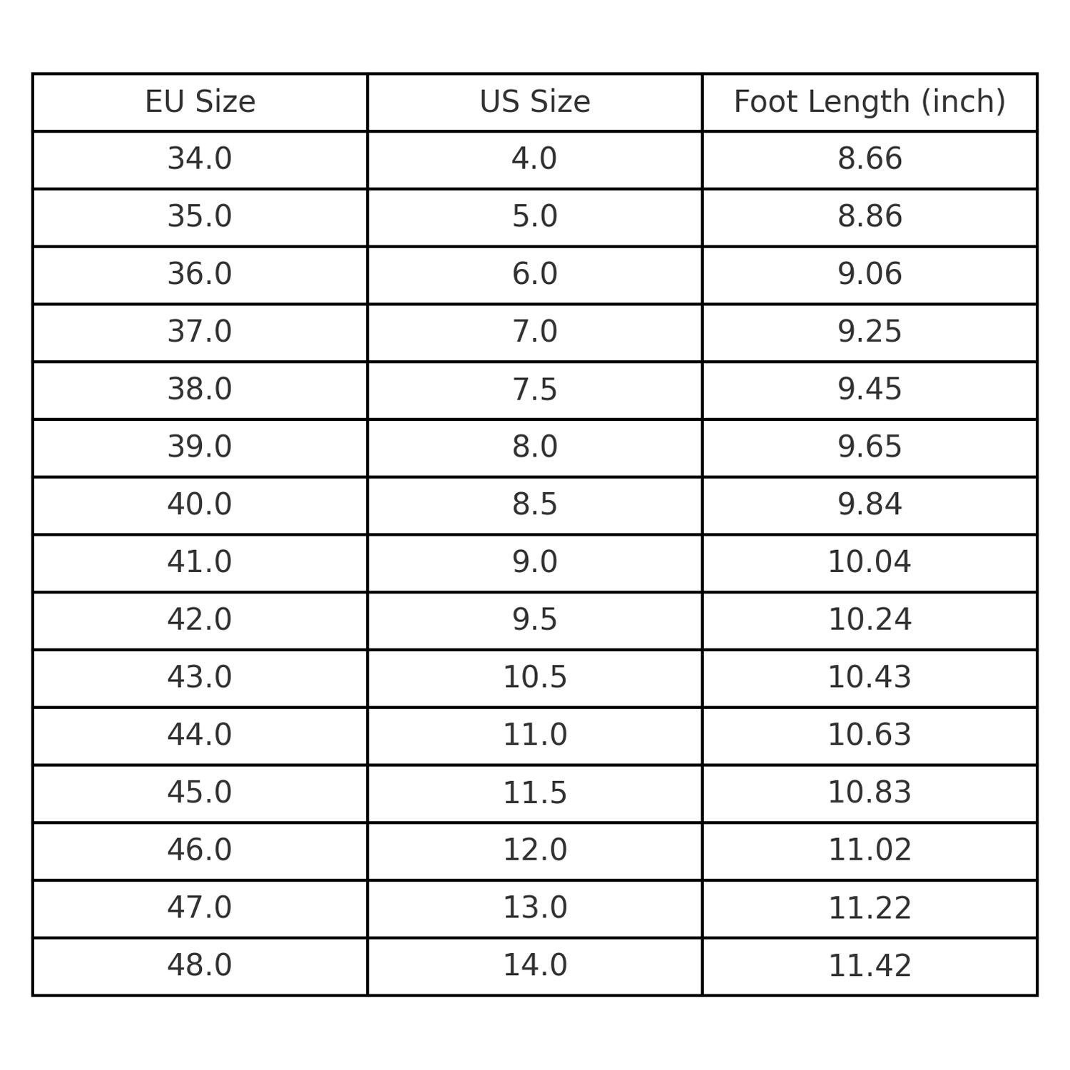True-to-Size Fit: Designed to match your regular shoe size for comfort and accuracy.